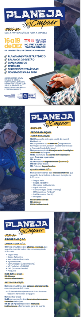 A Empresa Mato-grossense de Pesquisa, Assistência e Extensão Rural (Empaer) promove, entre os dias 16 e 19 de dezembro, o evento “Planeja Empaer 2025–26”, com a participação de servidores de todas as unidades do estado. A programação acontece das 7h às 17h30, no Instituto Federal de Mato Grosso (IFMT) – Campus Várzea Grande, localizado na Avenida Universitária, s/nº, bairro Novo Tempo.