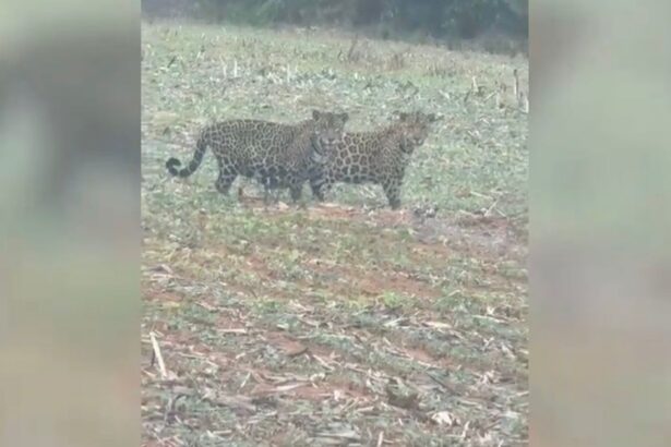 Duas onças-pintadas foram avistadas em uma fazenda localizada no município de Feliz Natal, em Mato Grosso. O registro chamou a atenção pela beleza e imponência dos animais, que aparecem caminhando tranquilamente pela área rural.