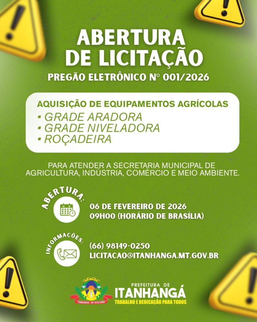 A Prefeitura Municipal de Itanhangá, no estado de Mato Grosso, anunciou a abertura de um novo processo licitatório com foco no fortalecimento das atividades do setor agrícola do município. A iniciativa visa a aquisição de equipamentos que irão atender às demandas da Secretaria Municipal de Agricultura, Indústria e Meio Ambiente.