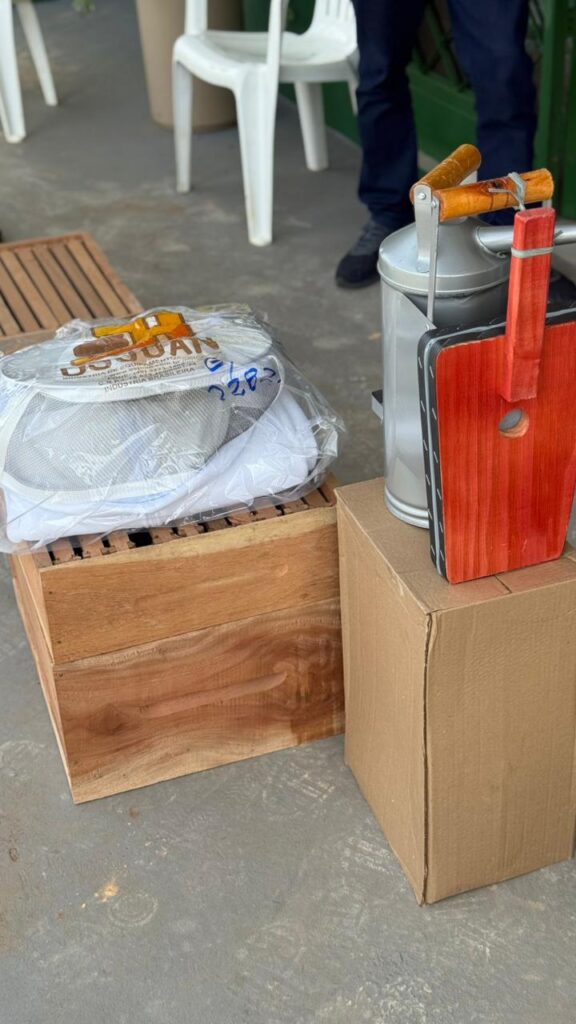 Durante a iniciativa, foram entregues cerca de 100 caixas de abelhas, além de macacões de apicultor e fumigadores, equipamentos essenciais para o trabalho seguro e responsável na apicultura. O objetivo é fortalecer a produção local de mel e incentivar práticas sustentáveis no manejo das colmeias.
