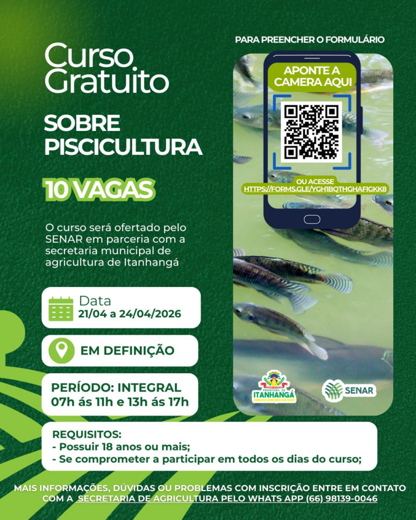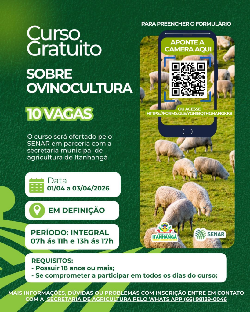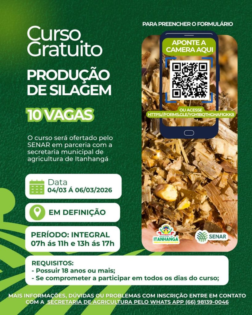 A Secretaria Municipal de Agricultura, Indústria, Comércio e Meio Ambiente de Itanhangá (MT) está com inscrições abertas para quatro cursos gratuitos voltados ao fortalecimento da produção rural no município. As capacitações contemplam áreas estratégicas da agropecuária local e representam uma oportunidade para produtores, trabalhadores do campo e demais interessados aprimorarem seus conhecimentos técnicos.