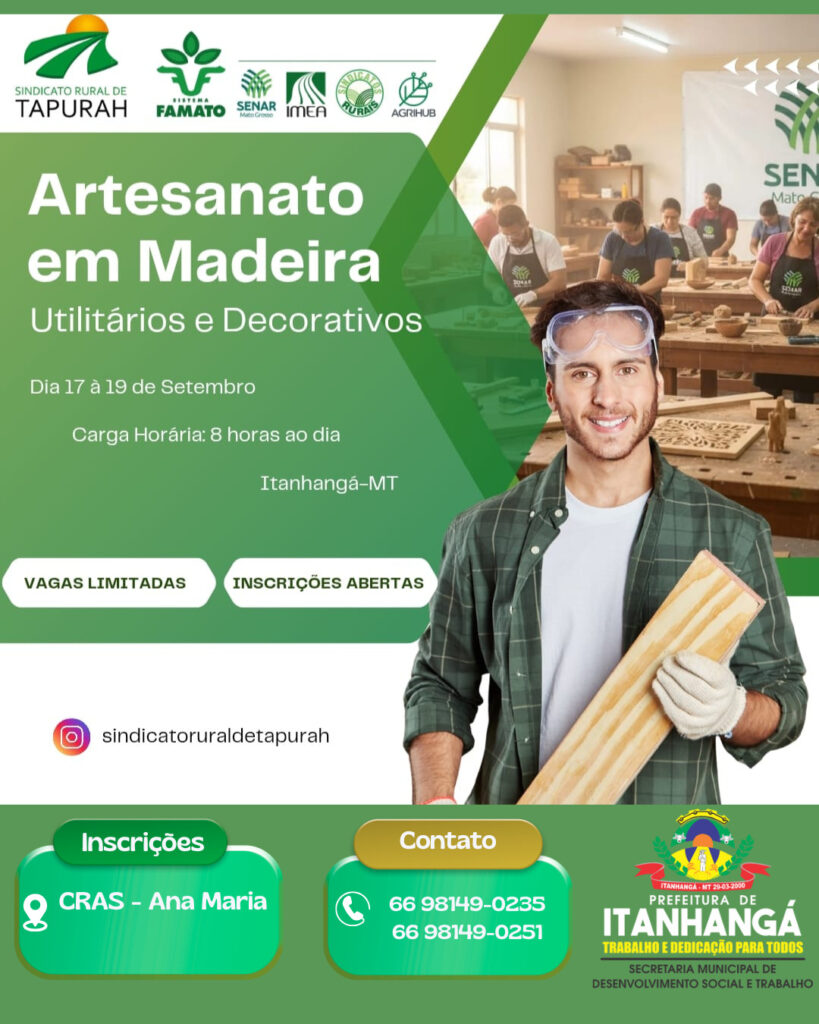 A prefeitura Municipal de Itanhangá-MT, por intermédio da Secretaria de Desenvolvimento Social e em parceria, com o Sindicato Rural de Tapurah, Sistema Famato, SENAR-MT, IMEA, Sindicatos Rurais, e AGRIHUB, estarão promovendo nos dias (17 a 19) o Curso de Artesanato em Madeira Sustentável, as inscrições estão abertas com vagas limitadas, maiores informações você vai obter Banner de divulgação