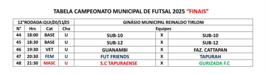O Ginásio Reinaldo Tirloni será palco de mais uma noite intensa de disputas pelo Campeonato Municipal de Futsal de Itanhangá -MT, edição 2025 . Nesta quarta-feira, 20 de novembro, feriado nacional, três partidas decisivas prometem atrair bom público e elevar a temperatura das arquibancadas.