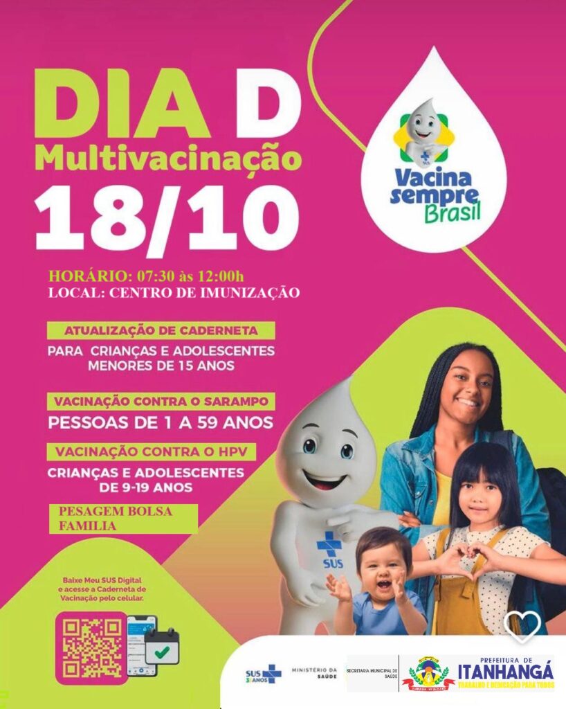 A Prefeitura de Itanhangá (MT), por meio da Secretaria Municipal de Saúde, realiza neste sábado, 18 de outubro, o Dia D da Campanha de Multivacinação. A ação acontece das 7h30 às 12h, no Centro de Imunização, e é voltada principalmente para crianças, adolescentes e beneficiários do programa Bolsa Família.