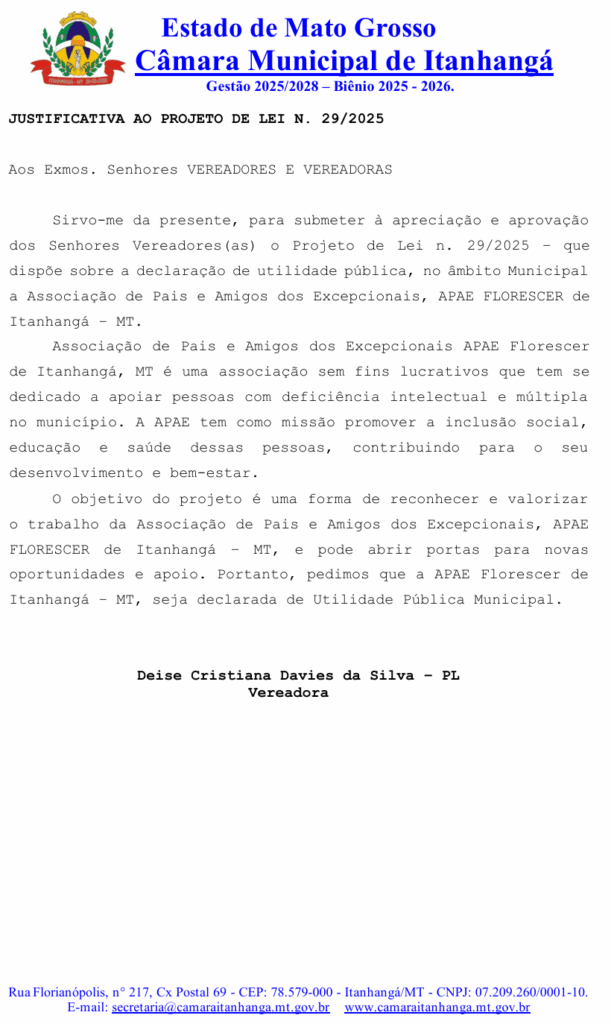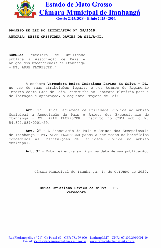 Itanhangá (MT) – A Câmara Municipal de Itanhangá aprovou, em sessão ordinária realizada no dia 3 de novembro de 2025, o Projeto de Lei Legislativo nº 29/2025, de autoria da vereadora Deise Cristiana Davies da Silva (PL). A proposta declara de utilidade pública municipal a Associação de Pais e Amigos dos Excepcionais de Itanhangá – APAE Florescer.