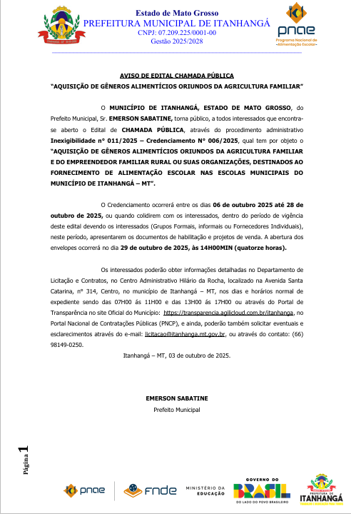A Prefeitura Municipal de Itanhangá-MT. divulgou nessa segunda feira dia (06-10) edital de chamada publica para aquisição de gêneros alimenticios oriundos da agricultura familiar. Na integra voce confere todas as informações acerca do edital, expedido pela Prefeitura Municipal de Itanhangá-MT.
