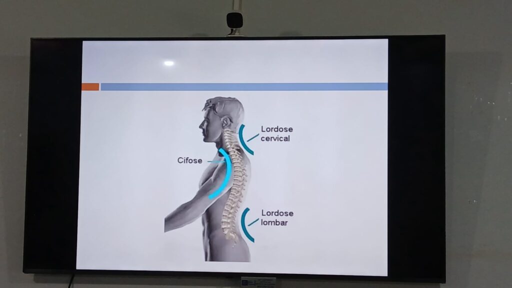 Durante o encontro com os alunos, Duffeke apresentou orientações sobre a anatomia e fisiologia da coluna, desde a região cervical até a lombar, destacando as curvaturas naturais do corpo humano e explicando como elas se formam e se mantêm ao longo do crescimento.