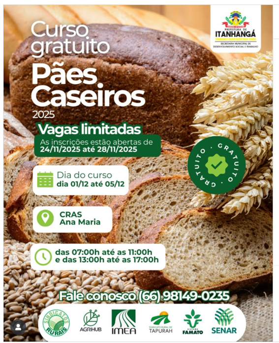 O município de Itanhangá abre mais uma oportunidade gratuita de qualificação profissional. O Curso de Pães Caseiros 2025, promovido pelo CRAS Ana Maria e pela Secretaria de Desenvolvimento Social e Trabalho, será realizado em parceria com o SENAR e o Sindicato dos Trabalhadores Rurais de Tapurah. As vagas são limitadas e as inscrições já têm data marcada.