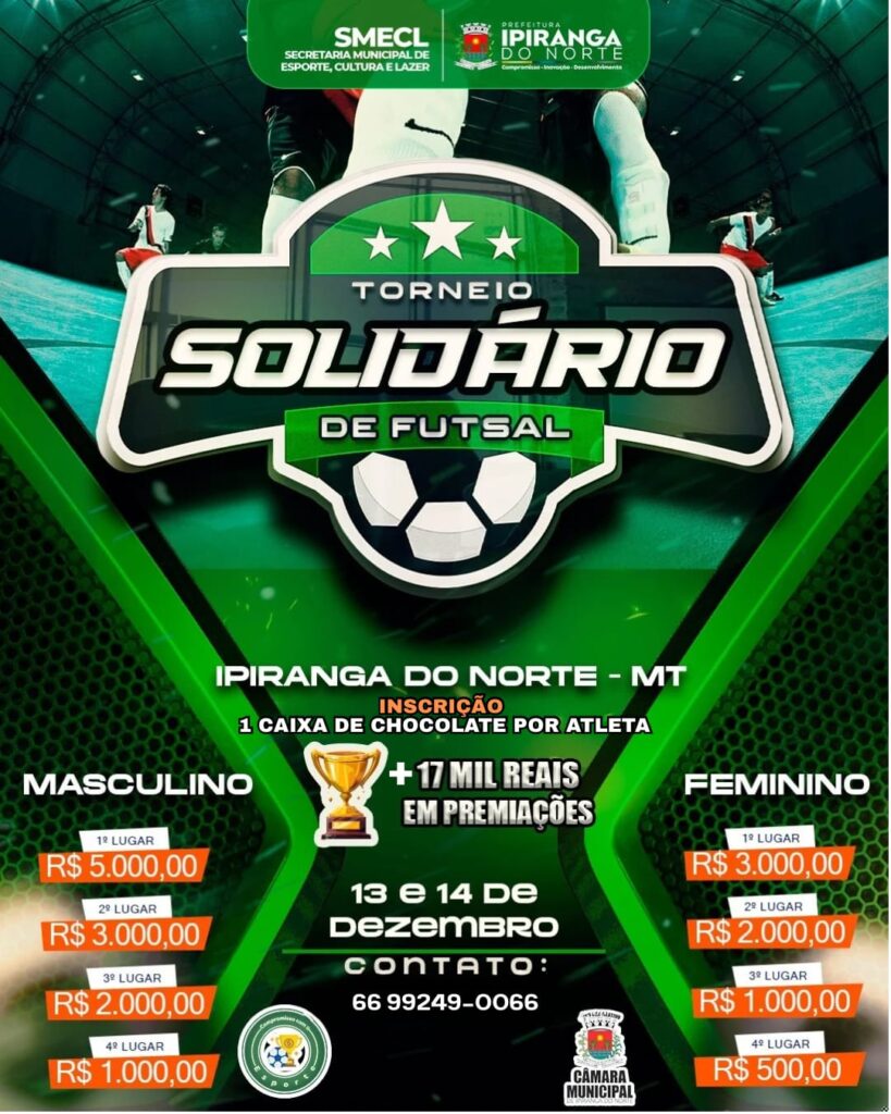 A Prefeitura Municipal de Ipiranga do Norte, por meio da Secretaria Municipal de Esporte, Cultura e Lazer, anunciou a realização de um torneio solidário de futsal nos dias 13 e 14 de dezembro. O evento promete movimentar atletas da região e arrecadar doações, oferecendo premiações significativas nas categorias masculino e feminino.