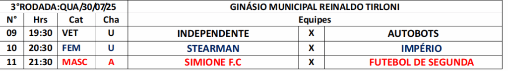 A primeira copa Sicredi de futsal de Itanhangá-MT, tem sequencia na noite dessa quarta feira, com mais três partidas pela 3ª rodada da competição Municipal , os jogos serão realizadas na quadra de esportes do ginásio Reinaldo Tirloni em Itanhangá-MT, a seguir tabela completa da rodada de hoje dia (30-07)