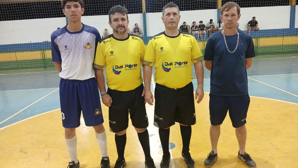 Equipe de arbitragem no centro da foto AELTON E GILSON com os capitães de branco CASSOL da ESCOLINHA e o AMARELINHO da VLK MAT PARA CONSTRUÇÃO.