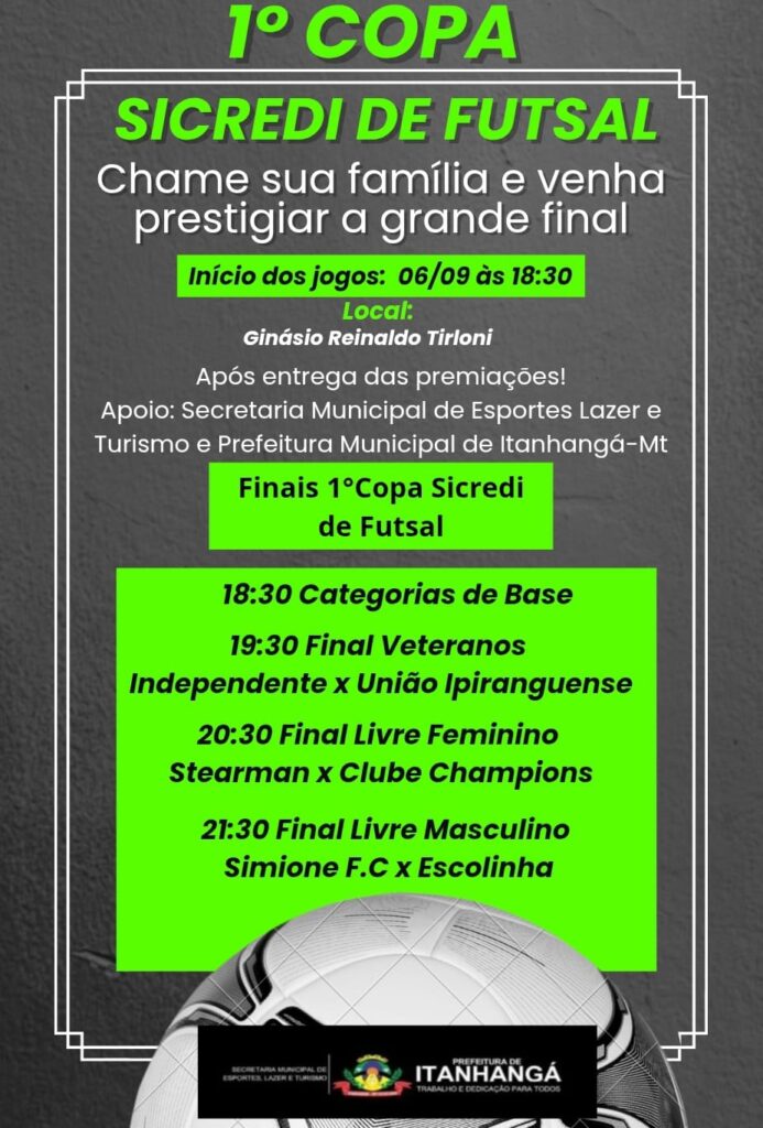 A 1ª Copa Sicredi de futsal de Itanhangá-MT, edição 2025 chega ao final hoje dia (06-09) A partir das 19:30hs na quadra do ginásio Reinaldo Tirloni conforme banner de divulgação da Coordenadoria de Esportes de Itanhangá-MT.