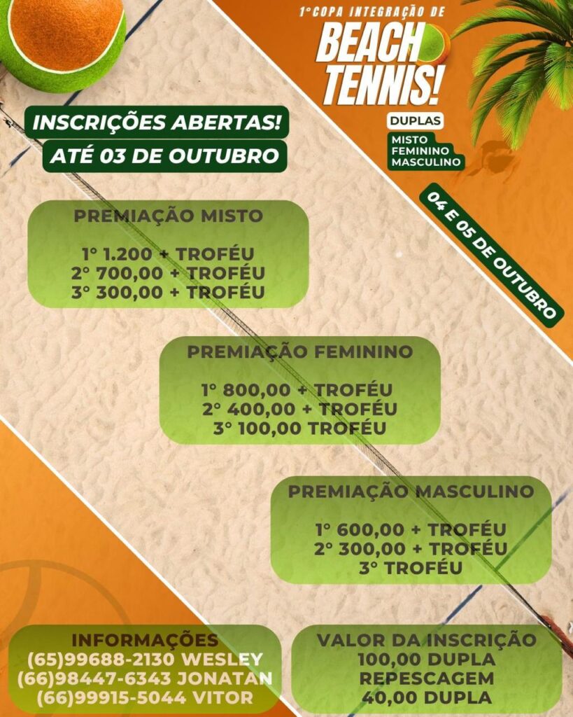 A competição será disputada em duplas, com categorias Masculino, Feminino e Misto. As partidas seguirão o formato tradicional da modalidade e visam incentivar a prática esportiva no município, além de promover o beach tênis como alternativa de lazer e bem-estar.
