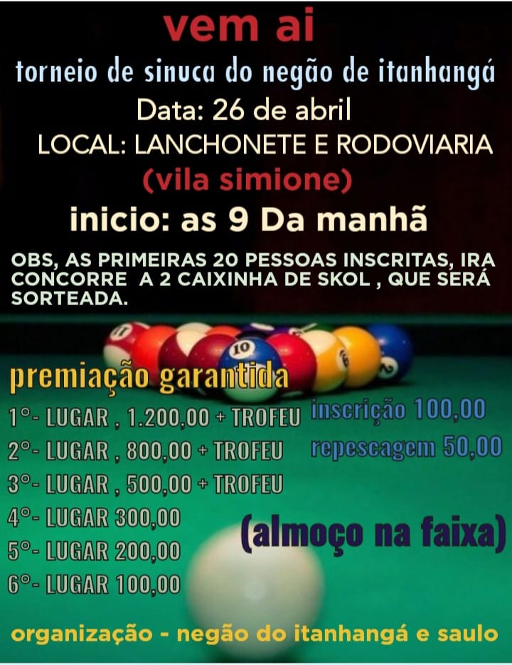 Itanhangá (MT) será palco de mais um evento esportivo neste sábado, 26 de abril. O tradicional Torneio de Sinuca do Negão será realizado na Lanchonete e Rodoviária, localizada na Vila Simone, com início previsto para às 9h.