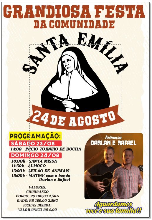 A comunidade de Santa Emília, no municipio de Itanhangá-MT, realiza hoje grande festa, que teve inicio ontem sábado dia (24-08) com o TORNEIO DE BOCHA, hoje domingo segue com grande atrações: A seguir voce confere a programação da grandiosa festa da comunidade de SANTA EMILIA em Itanhangá-MT.