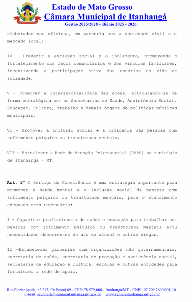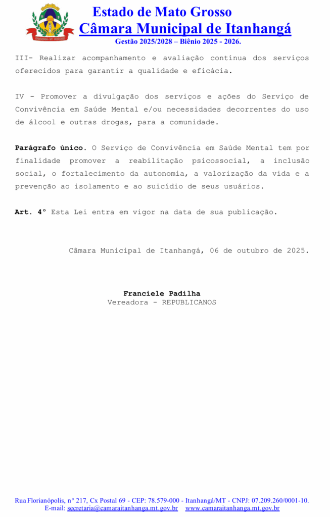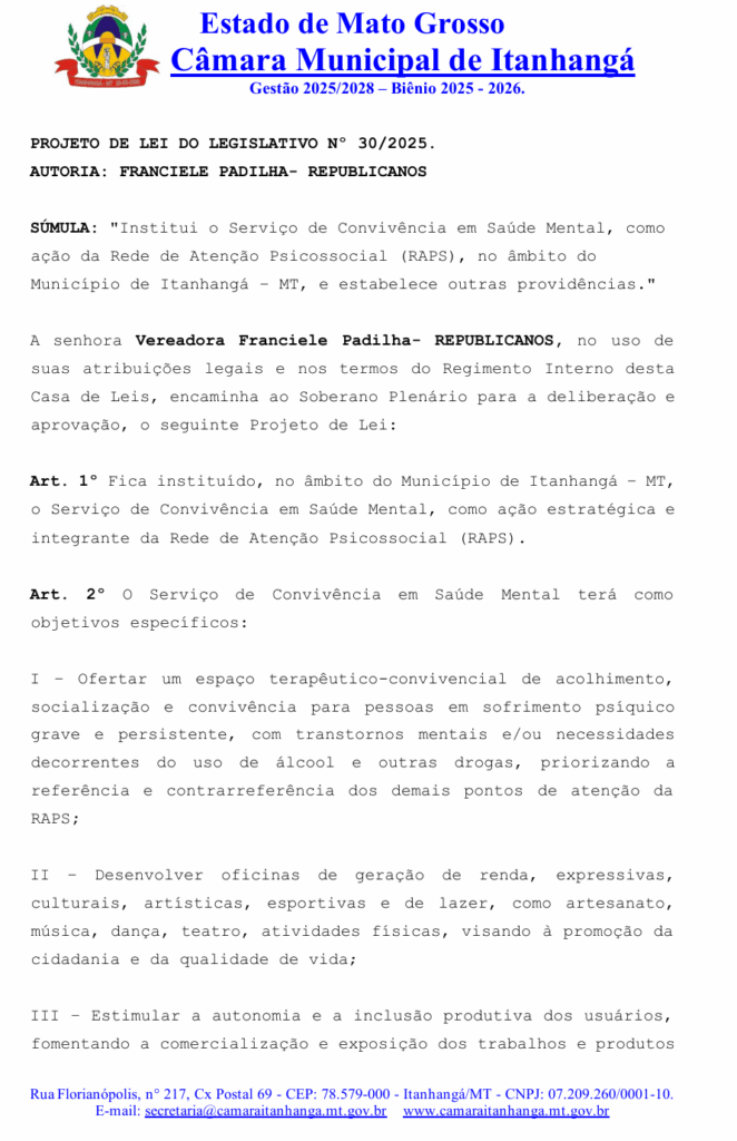 A vereadora Franciele Padilha (Republicanos) apresentou na sessão ordinários nº 262 da Câmara Municipal de Itanhangá o Projeto de Lei nº 30/2025, que institui o Serviço de Convivência em Saúde Mental como uma nova ação integrante da Rede de Atenção Psicossocial (RAPS) no município. A proposta tem como objetivo oferecer espaços terapêuticos, atividades de integração social e oportunidades de geração de renda para pessoas em sofrimento psíquico ou com transtornos mentais.