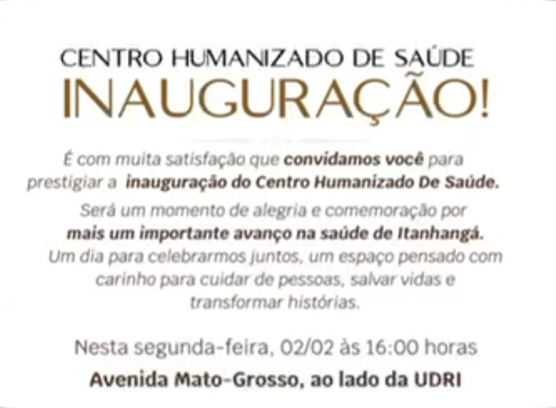 A Prefeitura Municipal de Itanhangá (MT) inaugura nesta segunda-feira, 02 de fevereiro, o Centro Humanizado de Saúde (CHS), um importante investimento voltado à melhoria do atendimento à saúde da população itanhangaense. A solenidade está marcada para as 16 horas, na Avenida Mato Grosso, ao lado da sala de fisioterapia.