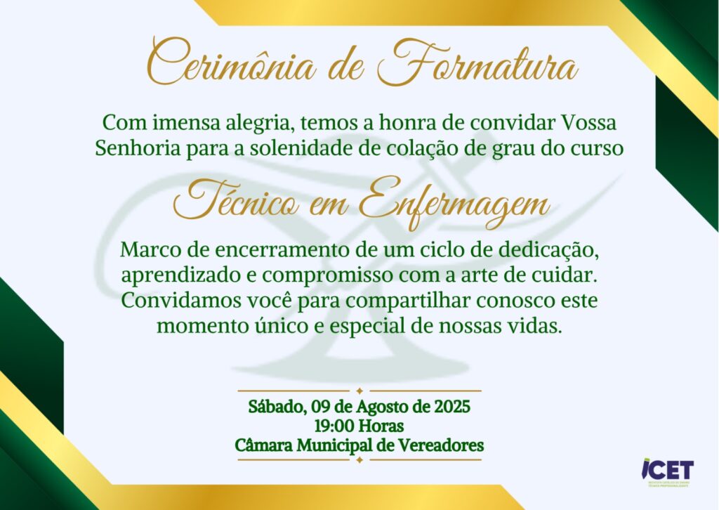 ICET instituto católico de ensino técnico profissionalizante, Em parceria com a Prefeitura Municipal de Itanhangá-MT, e com o opio do deputado Estadual Dilmar Dal Bosco através da emenda parlamentar nº 2445/2022 , Realizou no sábado dia (09-08).A solenidade de formatura da turma de Enfermagem do Municipio de Itanhangá-MT. O evento foi realizado no plenário da Câmara de Vereadores e contou com a presença das autoridades do Municipio.