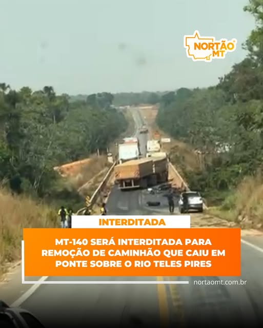 A rodovia MT-140, no trecho que liga a Santa Rita do Trivelato, será interditada na tarde desta terça-feira (16) para a retirada de um caminhão que caiu na região da ponte sobre o Rio Teles Pires.