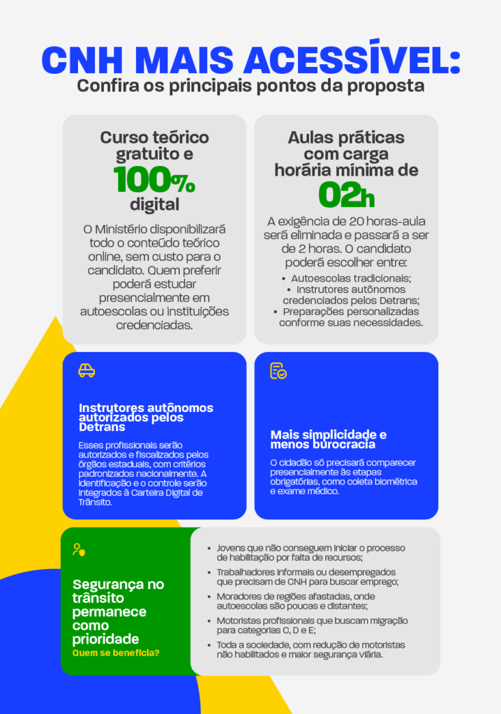 A resolução prevê curso teórico gratuito e digital, flexibilização das aulas práticas e abertura para instrutores credenciados pelos Detrans, reduzindo a dependência de modelos únicos e aumentando as opções para o cidadão. A abertura do processo poderá ser feita pelo site do Ministério dos Transportes ou pela Carteira Digital de Trânsito (CDT).